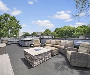 Escape to your next urban oasis in Charlotte, where a rooftop sanctuary awaits with stunning city skyline views, a private hot tub, fire pit, outdoor furniture and bar area. Enjoy arcade games and multiple HDTVs in the garage sports bar, or unwind in the spacious open concept living area with easy access to the private patio. With cozy rooms with a king bed in the master, and a prime location near top attractions, it's the ultimate city retreat